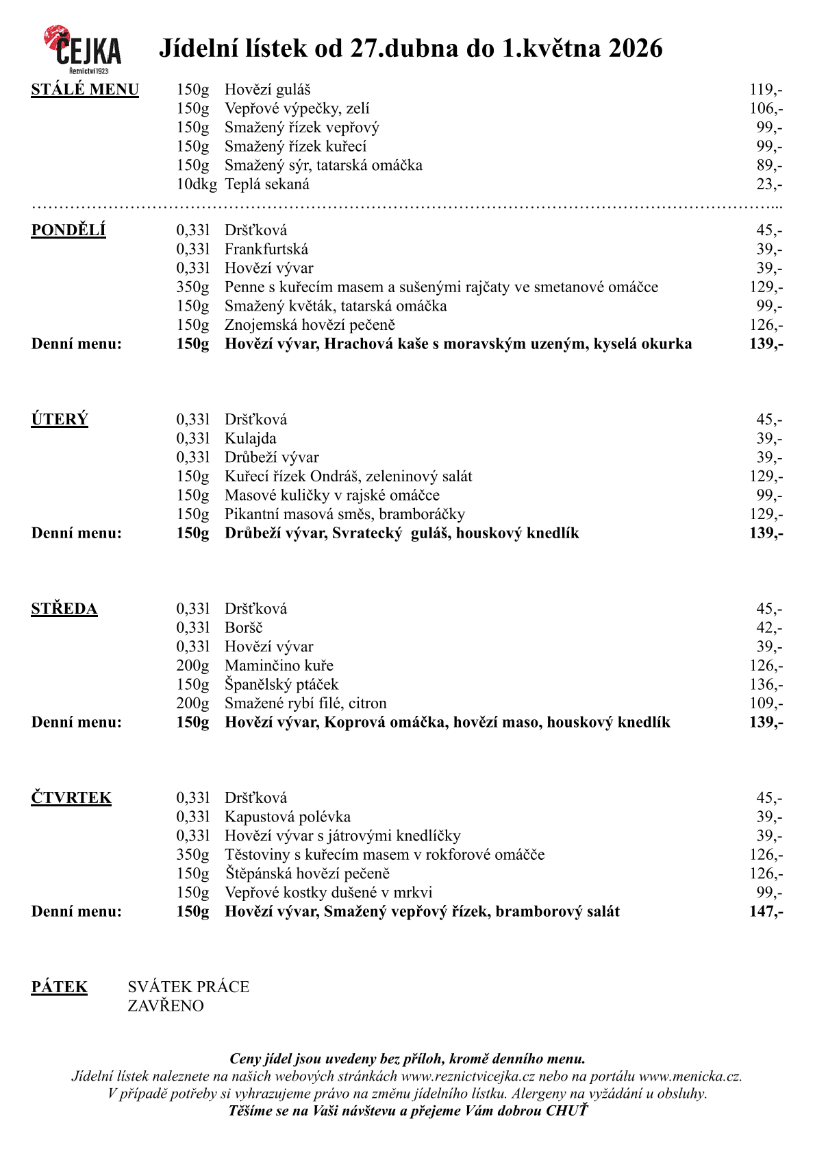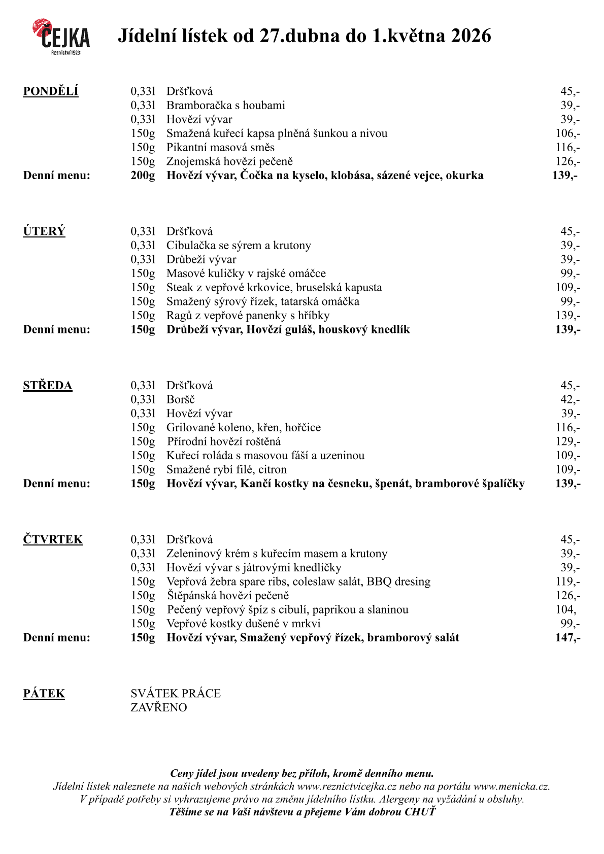 Jídelní lístky od 27.dubna do 1.května 2026
